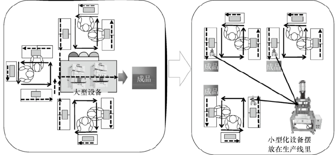 大型設備往往會為了追求生產的最大化而犧牲產品的切換次數(shù),這容易造成生產過量,生產了很多不需要的產品放到倉庫中。另外,大型設備在做流程化生產時,很難編排到生產線中形成連續(xù)流,這是因為設備太大、設備運行速度過快、很多生產線共用導致的。同時,大型設備的操作區(qū)域比較大,容易造成動作浪費和移動上的浪費。小型設備具有以下特點:節(jié)省空間,設備之間的距離比較近,當流程變化或實驗新產品時,把它們移動到另外的地方更容易。設備小型化,價格也就更便宜,這樣可以進一步擴大生產線,同時由于小型設備的穩(wěn)定性較強,可以減少維修的等待時間。小型化設備改善如下圖所示。
